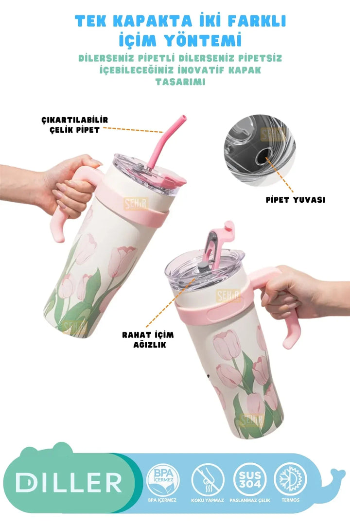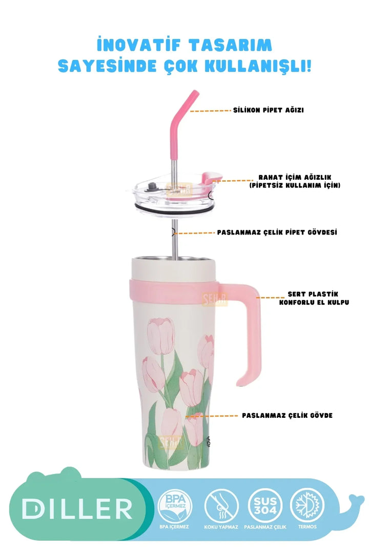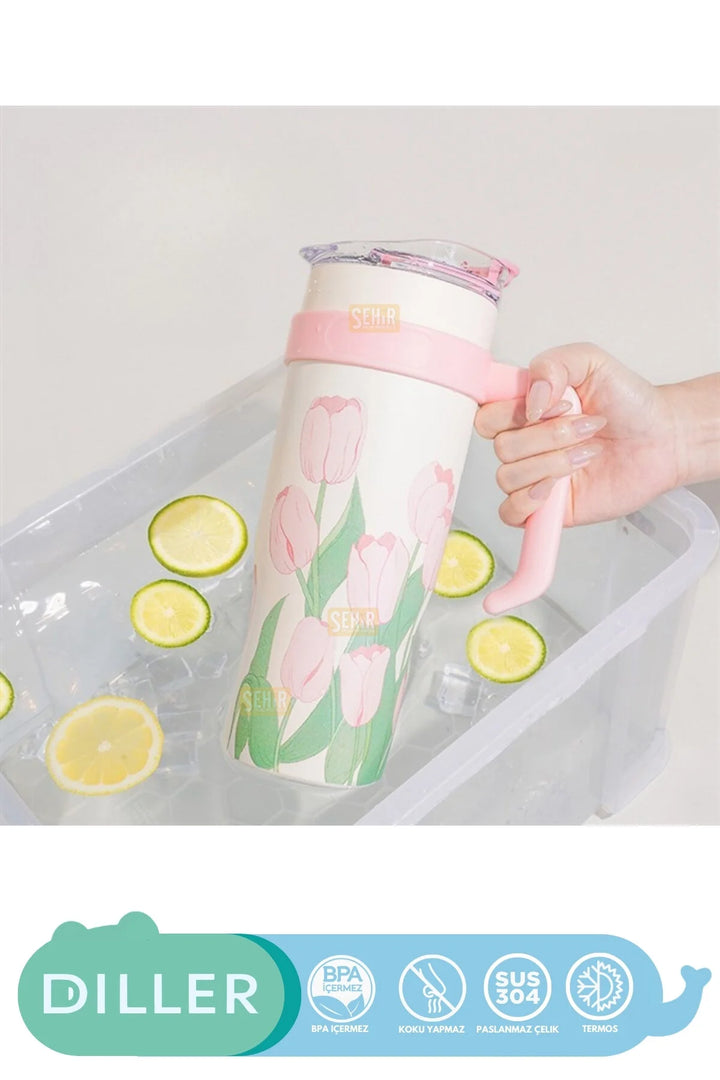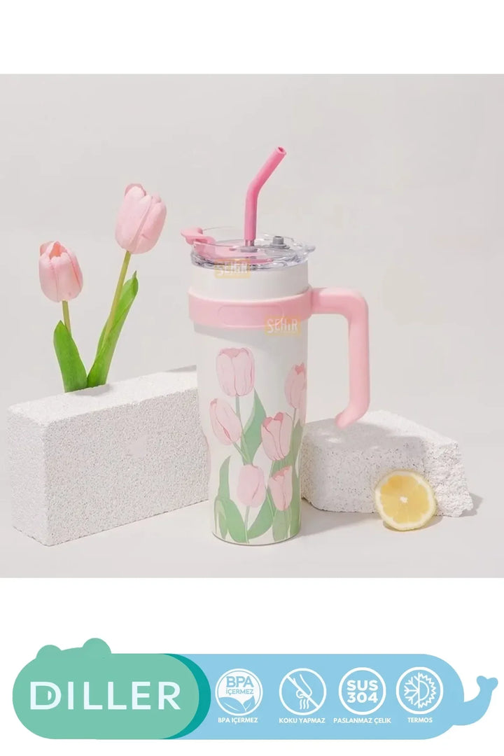 DILLER 1200ml Yeni Koleksiyon Pembe Lale Desenli Tumbler Pipetli/Pipetsiz Kulplu Paslanmaz Çelik Termos