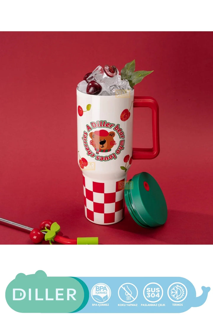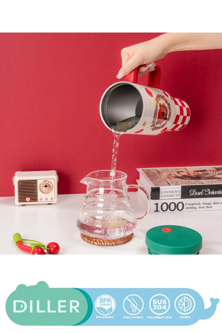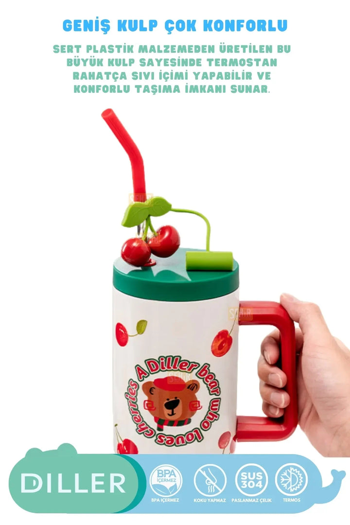 DILLER 1200ml Yeni Koleksiyon Sevimli Hayvanlar Tumbler Pipetli/Pipetsiz Kulplu Paslanmaz Çelik Termos