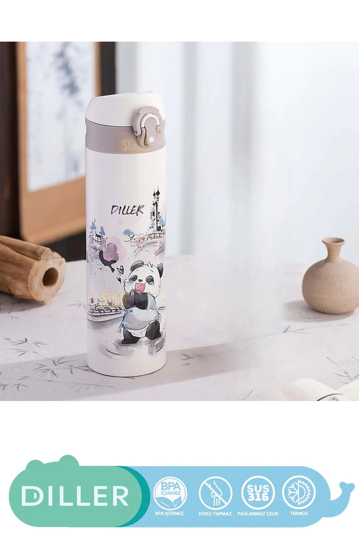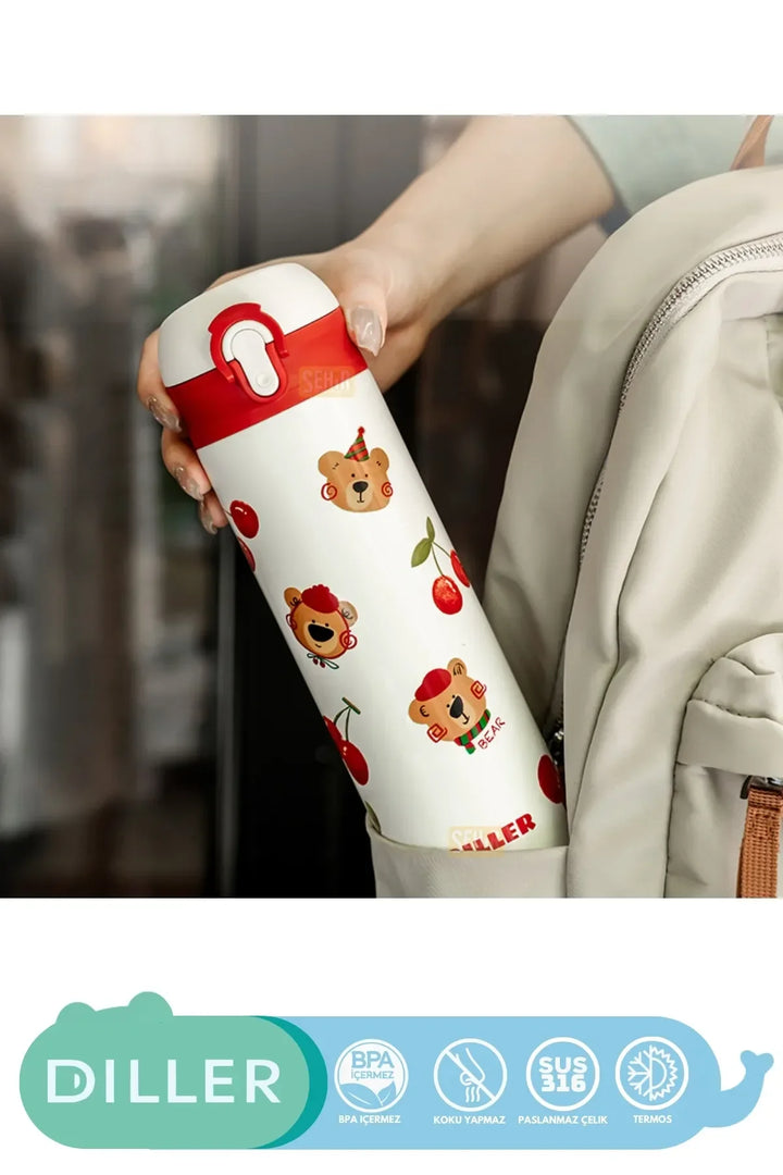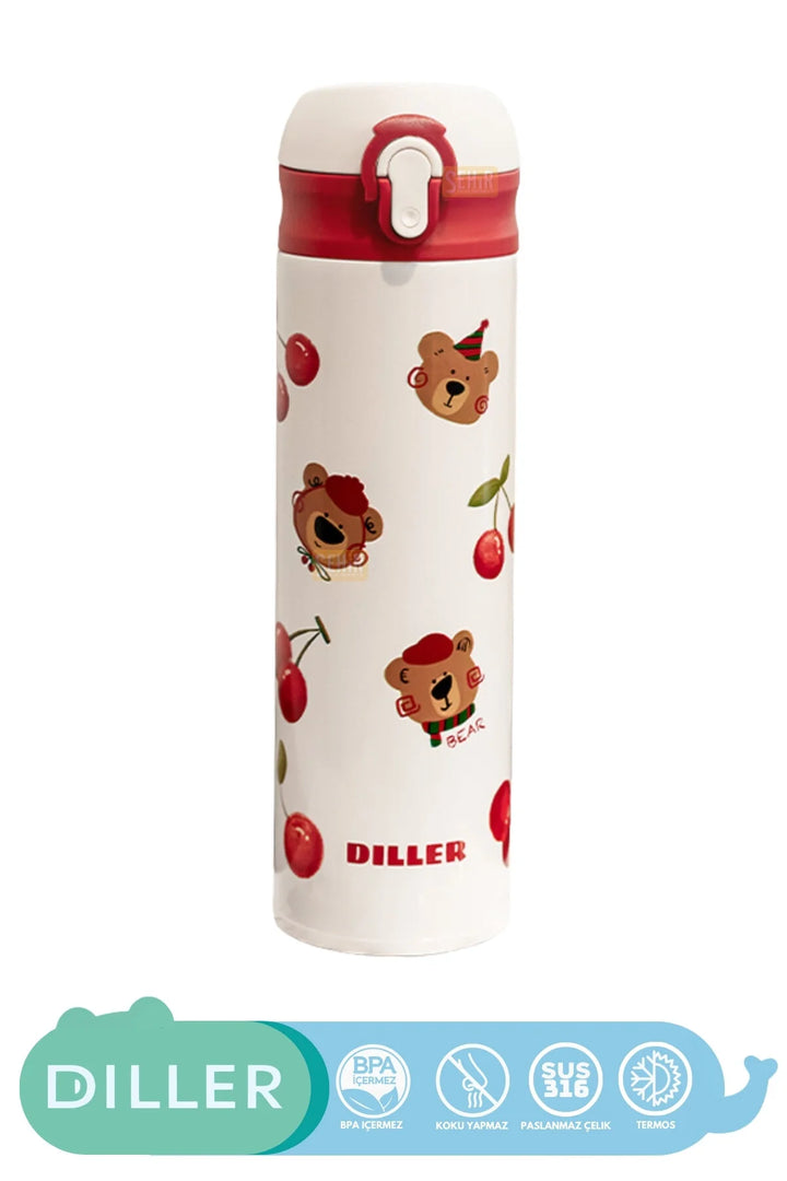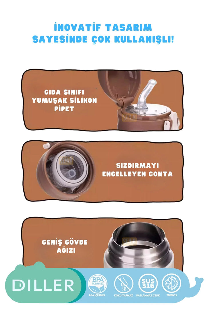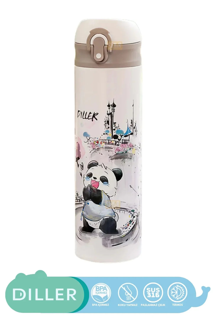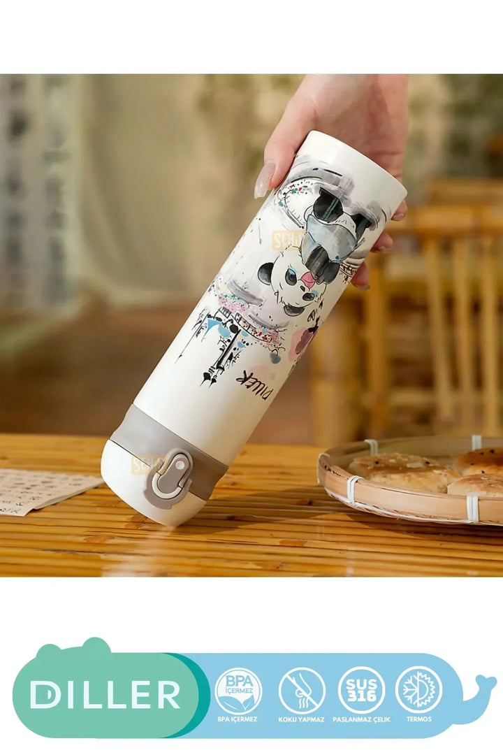 DILLER 480ml Yeni Koleksiyon Sevimli Hayvanlar Desenli Pipetli Kilitlenebilir Kapak Paslanmaz Çelik Termos