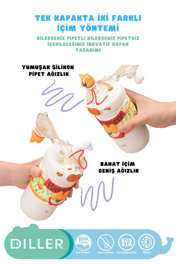 DILLER 520ml Yeni Koleksiyon Sevimli Hayvanlar Süslü Pipetli/Pipetsiz Boyun Askılı Paslanmaz Çelik Termos