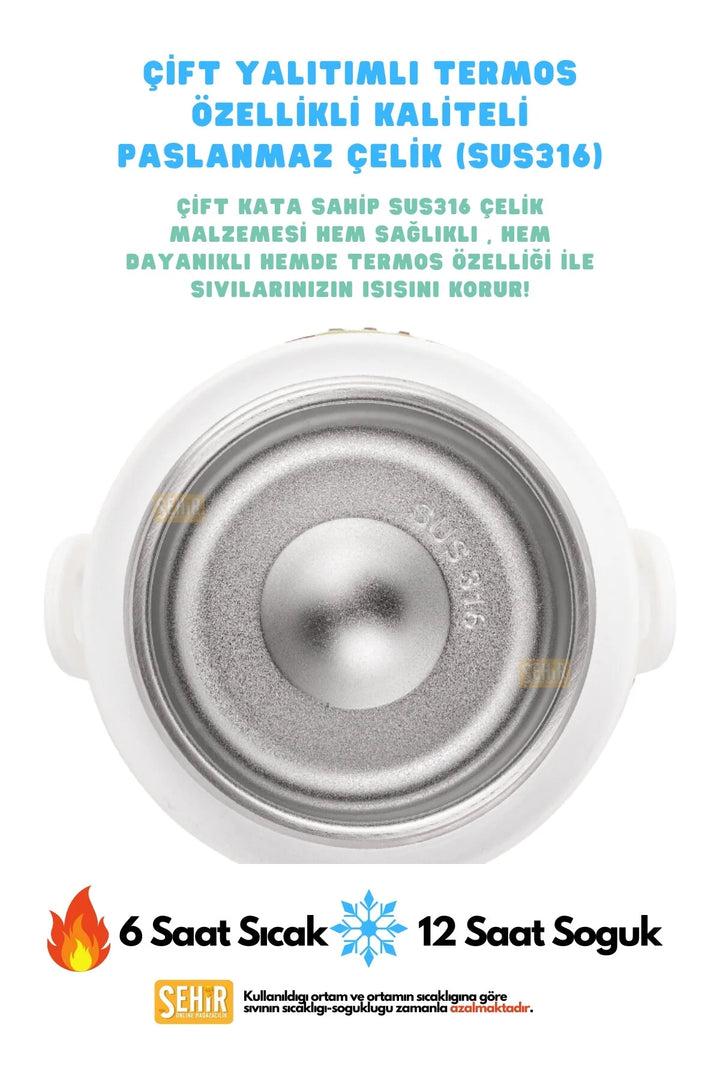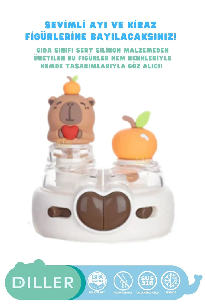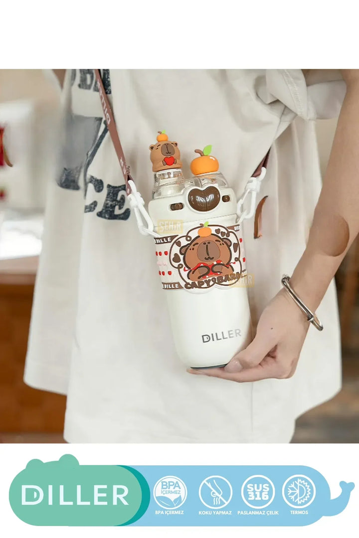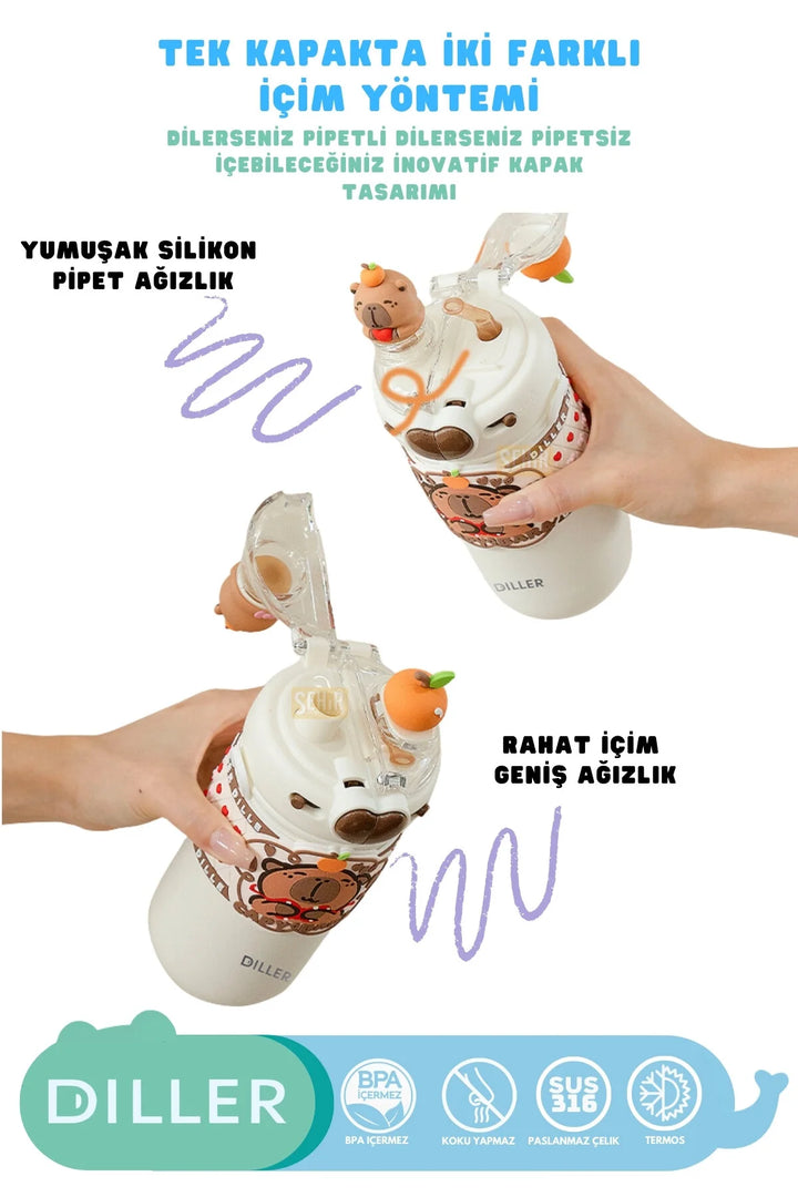 DILLER 520ml Yeni Koleksiyon Sevimli Hayvanlar Süslü Pipetli/Pipetsiz Boyun Askılı Paslanmaz Çelik Termos