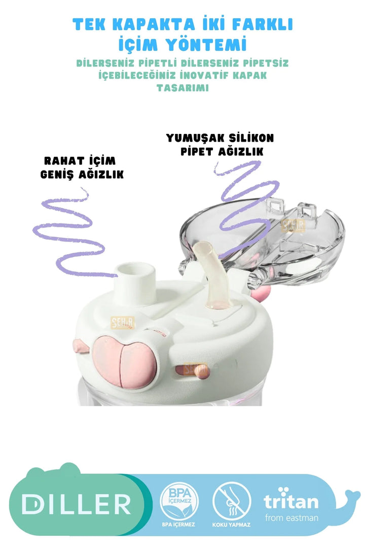 Diller 580ml Sevimli Hayvan Figürlü Tritan Matara | Pipetli & Pipetsiz Kullanım