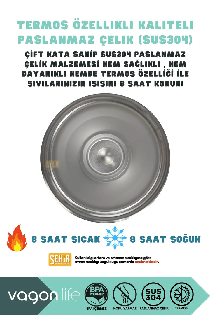 - Termos Etkisi : 8 saat sıcak / 8 saat soğuk (Önemli Not: Sıvınızın sıcak veya soğuk tutulma süresi çevre , çevre ısısı , kullanılan sıvı , vb.; gibi durumlar karşısında değişiklik gösterebilir.; ayırca belirtilen saatler boyunca "aynı" sıcaklıkta korumamaktadır, sıcak veya soğuk olarak kabul edilen derecelere kadar korumaktadır.; )
